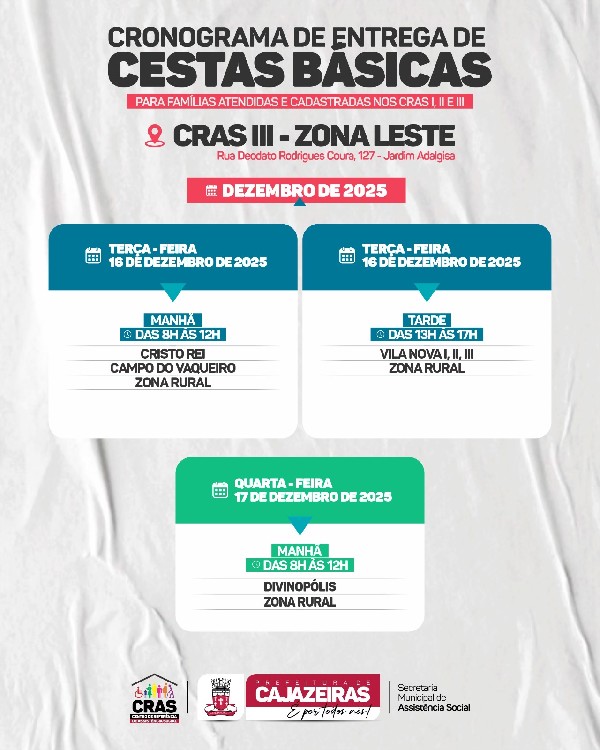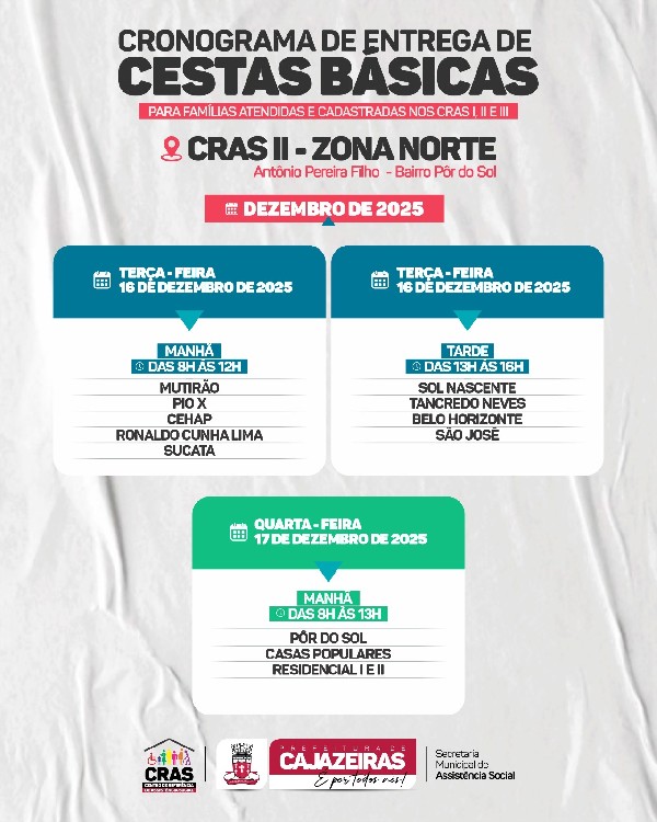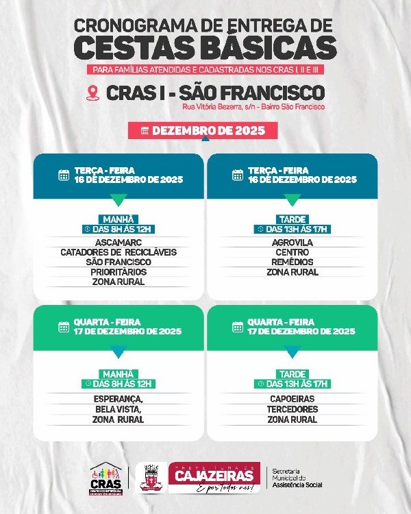 A Prefeitura de Cajazeiras através da Secretaria de Assistência Social divulgou nesta quinta-feira (11) o cronograma de distribuição das feiras do CRAS para as famílias cadastradas nos três centros de referência da cidades (norte, sul e zona leste).