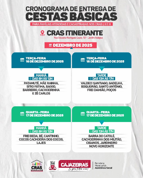 Prefeitura de Cajazeiras divulga cronograma de distribuição das feiras do CRAS referente a Dezembro