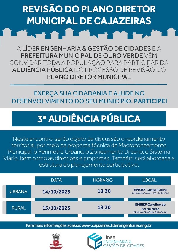 A Prefeitura de Cajazeiras, por meio da Secretaria de Planejamento e Desenvolvimento Urbano, realiza, nos dias 14 e 15 de outubro, a terceira audiência pública para discutir a revisão do Plano Diretor Municipal.