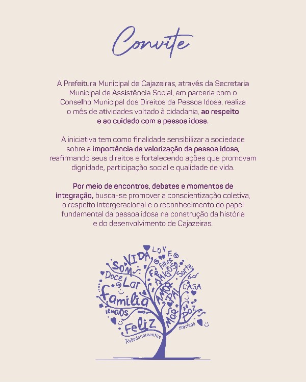 A iniciativa é da Prefeitura de Cajazeiras, por meio da Secretaria Municipal de Assistência Social, em parceria com o Conselho Municipal dos Direitos da Pessoa Idosa. O objetivo é promover momentos de integração, lazer e reconhecimento, além de reforçar a importância do cuidado, da valorização e do respeito à pessoa idosa.