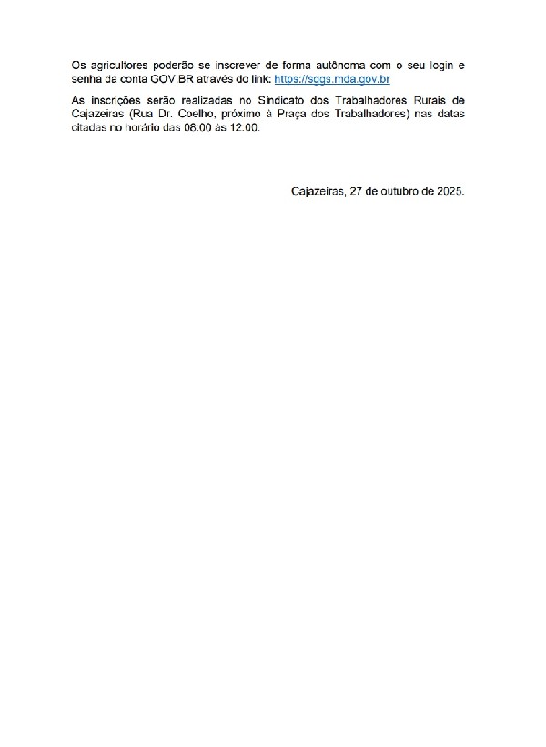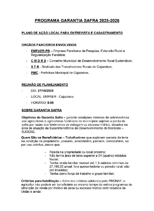 A Prefeitura de Cajazeiras através da Secretaria de Desenvolvimento Rural divulgou nesta segunda-feira (27) o cronograma do programa Garantia Safra 2025-2026.