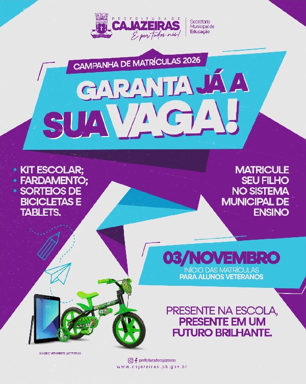 A Secretaria de Educação de Cajazeiras informa que já foi iniciado o período de matrículas para o ano letivo de 2026, com prioridade para os alunos veteranos (já matriculados na rede).