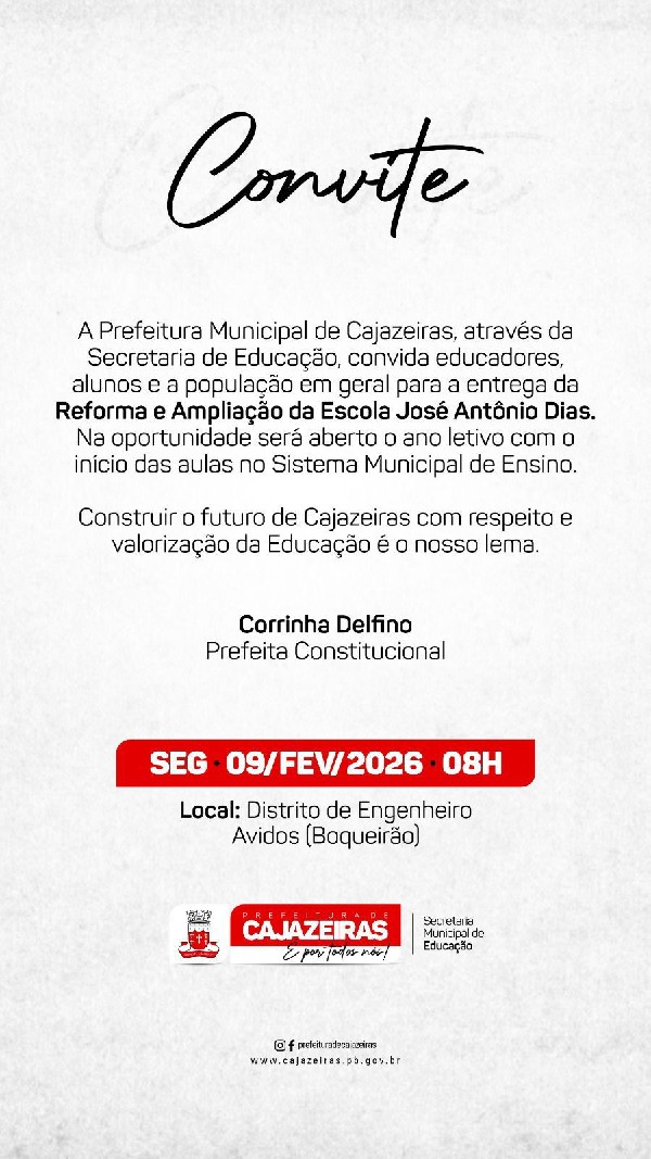 A Prefeitura de Cajazeiras inicia, nesta segunda-feira, dia 9 de fevereiro, o ano letivo 2026 nas creches e escolas do sistema municipal de ensino. Cada unidade escolar realizará sua própria recepção aos alunos matriculados, dando as boas-vindas para o novo período de atividades.