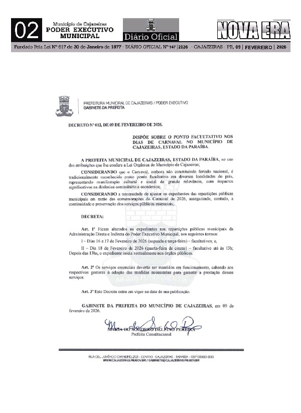 A Prefeitura Municipal de Cajazeiras decretou ponto facultativo nas repartições públicas nos dias 16 e 17, segunda e terça-feira. No dia 18 (quarta-feira de cinzas) facultativo até as 13 horas, com o expediente voltando ao normal após esse horário.