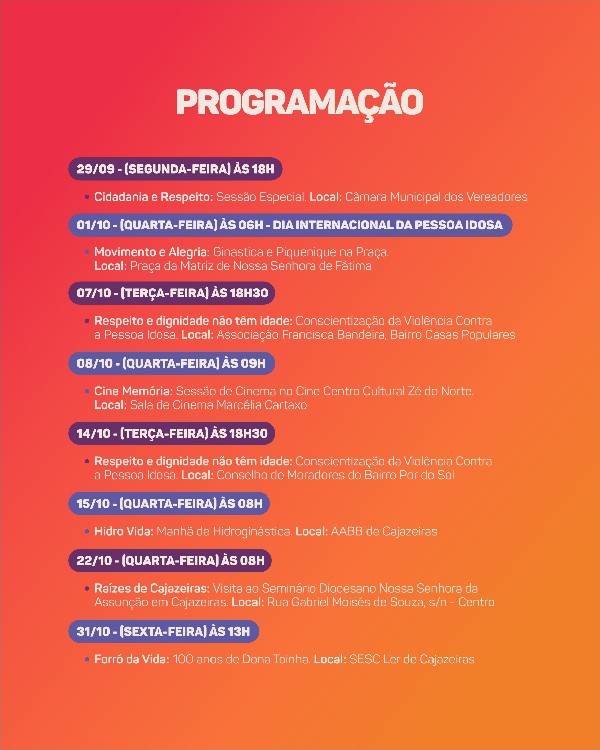 A iniciativa é da Prefeitura de Cajazeiras, por meio da Secretaria Municipal de Assistência Social, em parceria com o Conselho Municipal dos Direitos da Pessoa Idosa. O objetivo é promover momentos de integração, lazer e reconhecimento, além de reforçar a importância do cuidado, da valorização e do respeito à pessoa idosa.