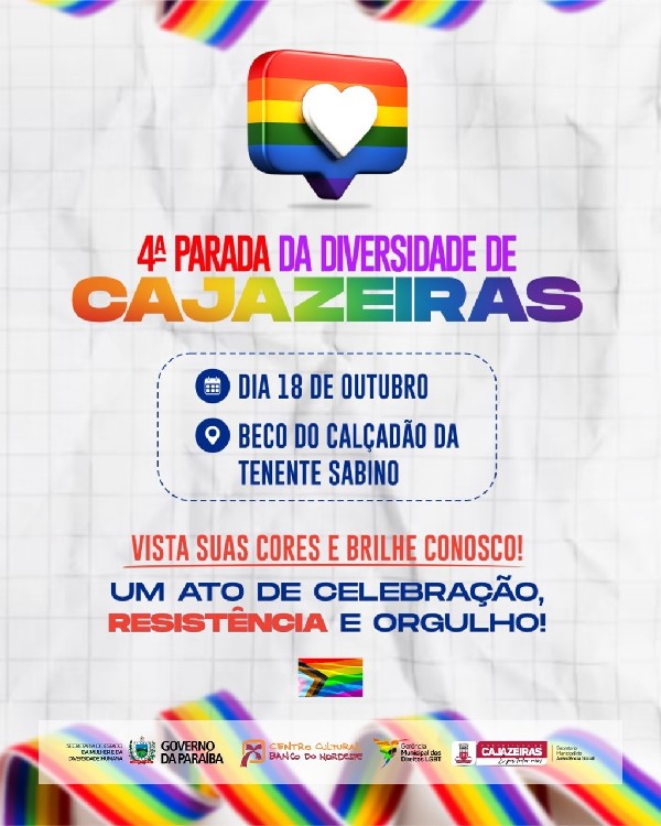 A Prefeitura de Cajazeiras, por meio da Gerência Municipal dos Direitos LGBT e Secretaria de Assistência Social, convida toda a população para participar da 4ª Parada da Diversidade da cidade, que acontece no próximo sábado (18), no Beco do Calçadão da Tenente Sabino.
