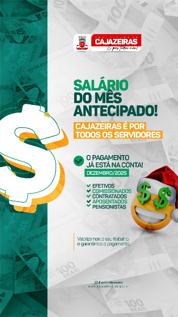 A prefeita de Cajazeiras, Corrinha Delfino, anunciou, por meio de suas redes sociais, na manhã desta terça-feira (23), a antecipação do pagamento integral da folha salarial referente ao mês de dezembro dos servidores públicos municipais. A medida contempla servidores efetivos, contratados, comissionados, além de aposentados e pensionistas.