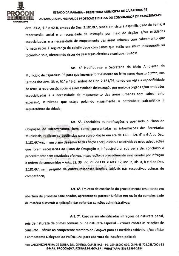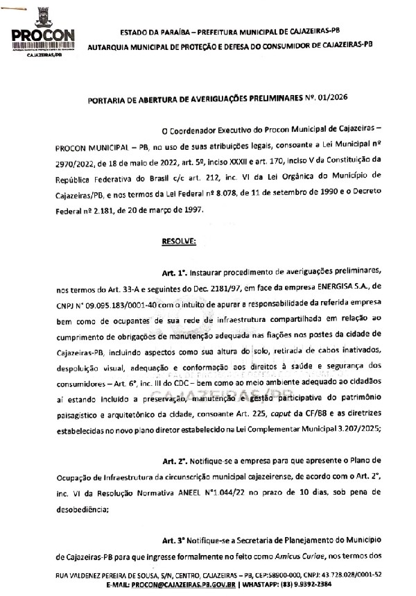Por conta disso, o Procon baixou portaria instaurando procedimento de averiguações preliminares, nos termos do Art. 33-A e seguintes do Dec. 2181/97, em face da empresa ENERGISA S.A., com o intuito de apurar responsabilidade da referida empresa bem como de ocupantes de sua rede de infraestrutura compartilhada em relação ao cumprimento de obrigações de manutenção adequada nas fiações nos postes da cidade de Cajazeiras-PB, incluindo aspectos como sua altura do solo, retirada de cabos inativados, despoluição visual, adequação e conformação aos direitos à saúde e segurança dos consumidores- Art. 6°, inc. IlIl do CDC- bem como ao meio ambiente adequado ao cidadãos aí estando incluído a preservação, manutenção e gestão participativa do patrimônio paisagístico e arquitetônico da cidade, consoante Art. 225, caput da CF/88 e as diretrizes estabelecidas no novo plano diretor estabelecido na Lei Complementar Municipal 3.207/2025;