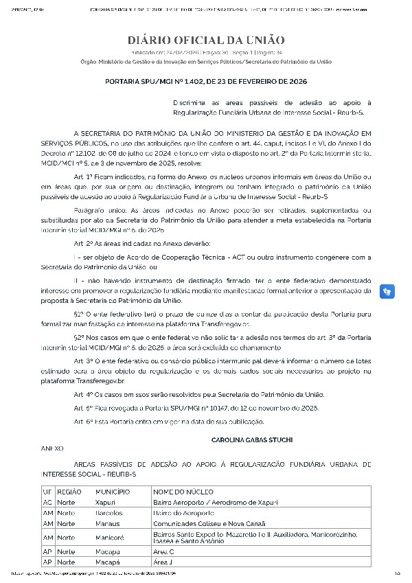 A inclusão da Agrovila na lista nacional é resultado de levantamentos técnicos e articulações institucionais conduzidos pela Secretaria Municipal de Planejamento e Desenvolvimento Urbano junto aos órgãos federais. A partir da publicação da portaria, o município deverá cumprir os prazos estabelecidos para formalizar a adesão e apresentar informações como número de lotes e dados sociais necessários para a continuidade do processo.