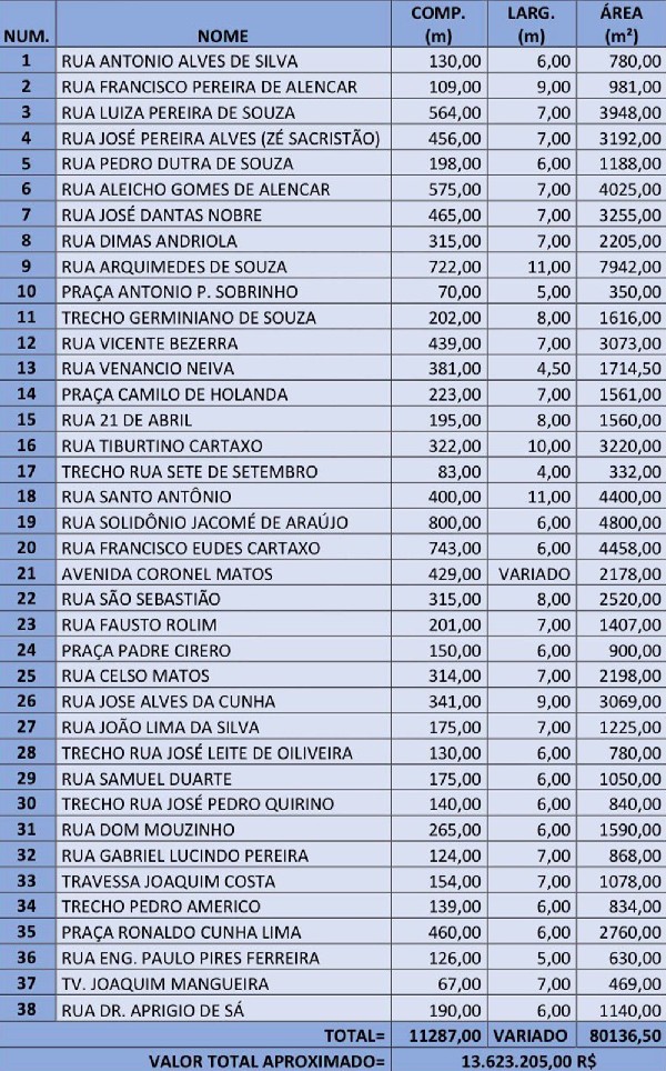 Veja abaixo a lista com os nomes das ruas contempladas com os recursos do governo do estado:
