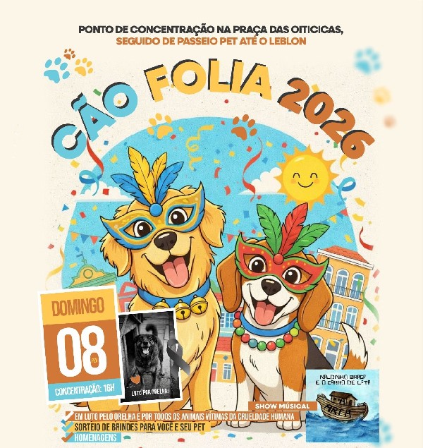 De acordo com os organizadores, o Cão Folia 2026 terá início às 16h00, com concentração na Praça das Oiticicas, seguida por um passeio até a Praça do Leblon, onde haverá um show musical com Naldinho Braga e o Carro de Lata.
